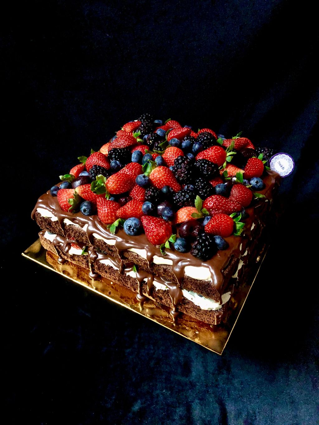 Baked square for easy portioning, for larger parties...a soft Valrhona chiffon with few extra shots of brandy and heaps of whole cherries and berries, finished with a good drizzle of smooth Brandy Valrhona ganache. Did we mention that the cake is brushed with Brandied cherry juice to keep it moist? This is a most delicious celebration cake.